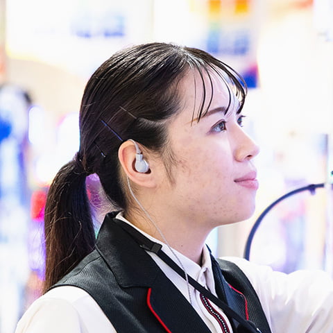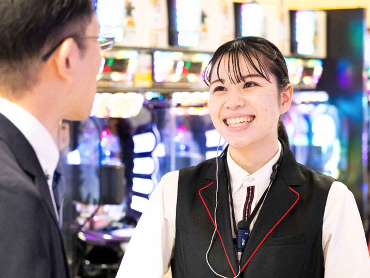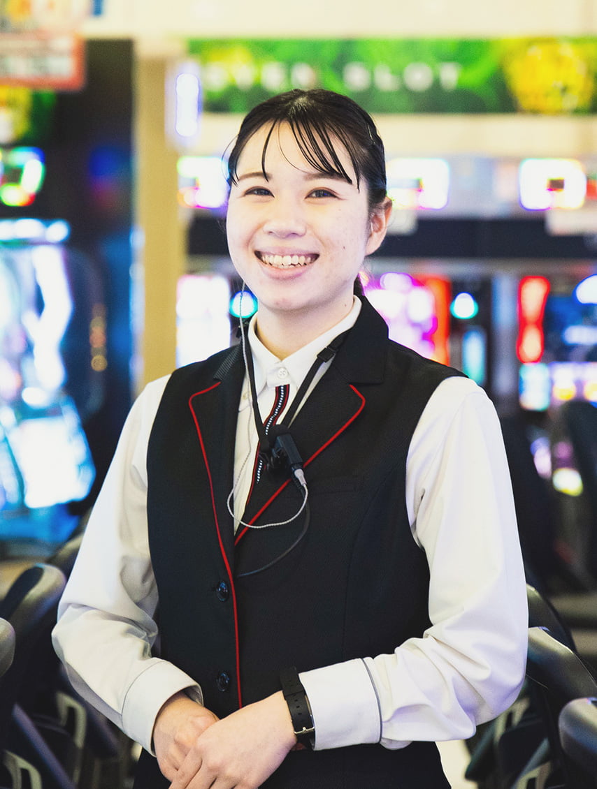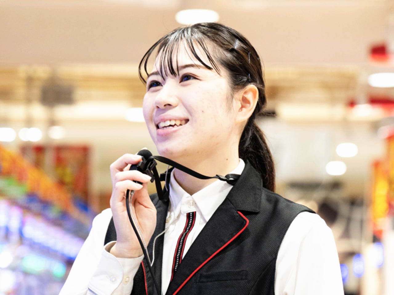 プライベートではパチンコやスロットの経験はなかったので、1年目は座学での新人研修や店舗での実機研修が頼りでした。でも台のトラブル対応もやってみたら「できた!」と感じることが多く、未経験でも不安になることは少なかったです。もともと接客が好きだったこともあってお客様と接するのは楽しく、スタッフ全員で連携してお客様のことを気にかけたり、対応したりといったチームワークの良さにも助けられています。仲間がいるからこそ仕事にやりがいを感じている毎日です。